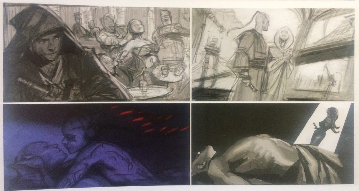 W „The Art of Star Wars: The Force Awakens” możemy też znaleźć krótki storyboard, w którym Talon zostaje napadnięta w barze. Ratuje ją Jedi i idą razem do łóżka. Na końcu kobieta morduje go we śnie. Jak jednak wiemy, żaden z tych pomysłów ostatecznie się nie ziścił.