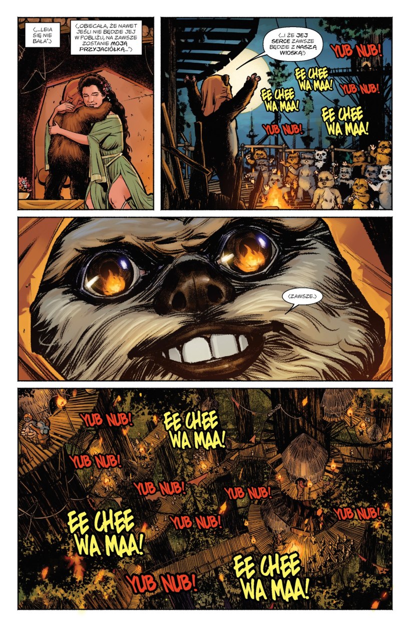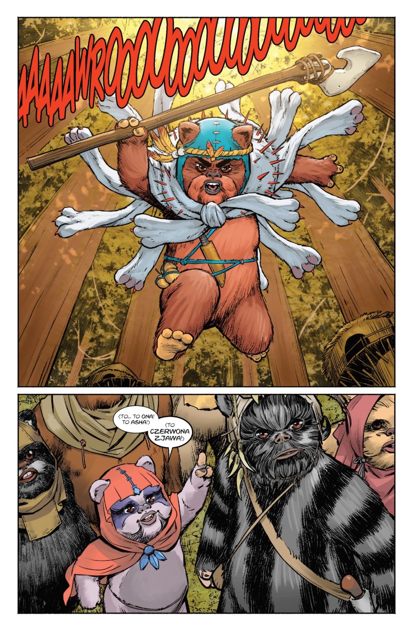 Uwielbiane Ewoki powracają z zupełnie nową przygodą w pojedynczym albumie z uniwersum „Star Wars”. Grupa łowców nagród i ryzykantów dowodzona przez oficera Imperium przybywa na lesisty księżyc Endora w poszukiwaniu tajnego składu śmiercionośnej broni! Czy jest jednak przygotowana na spotkanie z wojowniczymi Ewokami, które pokonały już tak wielu imperialnych żołnierzy? Kim jest tajemniczy nowy ewocki wojownik powracający do Wioski Jasnego Drzewa, i jaki jest jego związek z Wicketem W. Warrickiem?