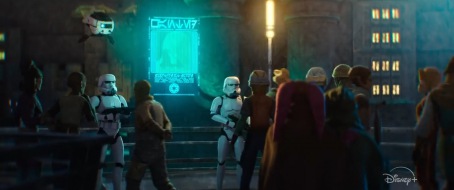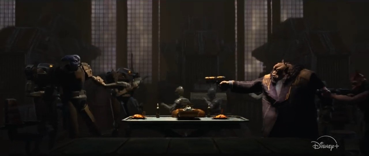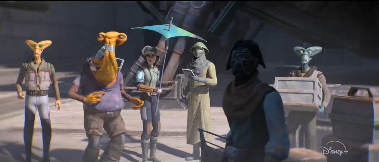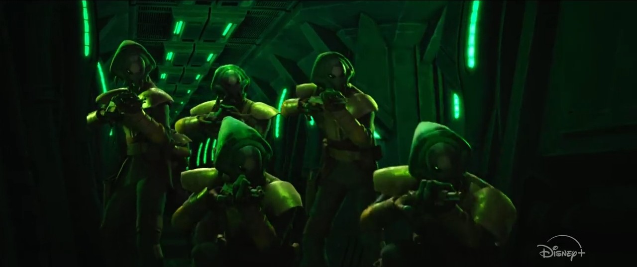 W podobnej scenerii widzimy postaci schodzące pionowo po ścianie budynku - wygląda na to, że ekipa Maula będzie dokonywała napadu bądź skoku. Pierwsza bohaterka bowiem przypomina trochę Mandaloriankę (Rook?), drugą natomiast jest nowy pomarańczowy Zabrak, który pojawi się za chwilę.