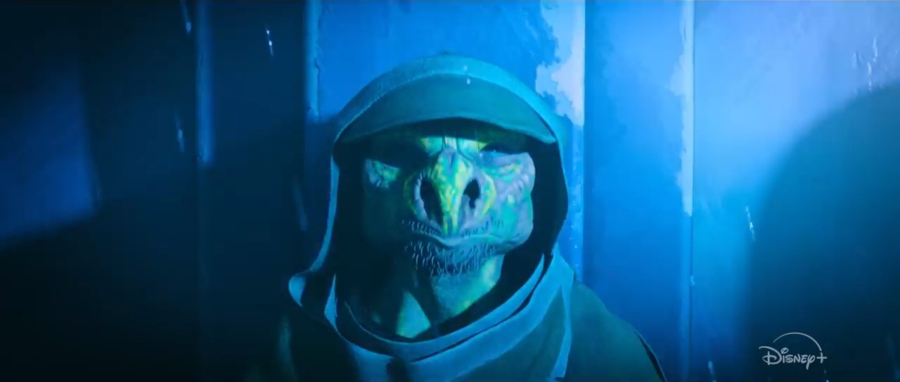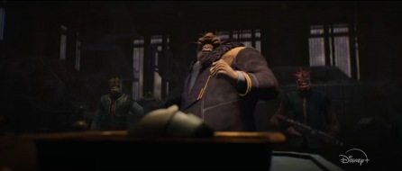 Skoro przy napadach jesteśmy, to spójrzmy na bossów półświatka. Ten stylizowany na Kingpina Gran to Deemis, co wiemy z zapowiedzi na stronie Marvela. W zwiastunie z Celebration rozmawia z ubranym w mechaniczny strój Aleeną o tym, że pojawił się nowy gracz na planecie, który dokonał niezwykłego skoku. Ale jak widać dojdzie pomiędzy nimi do nieporozumienia. Aleenę ochraniają nowe rodzaje droidów, a obok Deemisa stoją trandoshańscy ochroniarze.