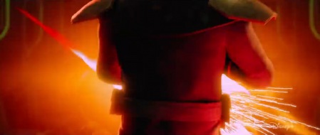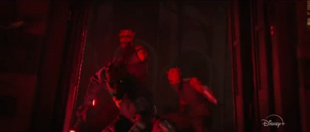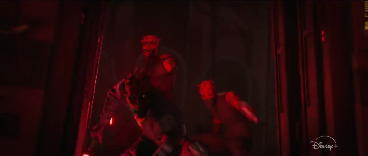 Tutaj nie widać za dobrze, bo panowie pojawiają się dosłownie na ułamek sekundy - Maulowi pomagają dwaj Zabrakowie, jeden pomarańczowy, drugi potężny, przywodzący na myśl trochę Savage'a. Czyżby nasz główny bohater ściągnął do pomocy Braci Nocy? A może to po prostu zabrakańscy opryszkowie z innego miejsca? Już niedługo się dowiemy. Mężczyźni najprawdopodobniej walczą ze szturmowcami, którzy są widoczni w podobnie oświetlonym czerwienią korytarzu.