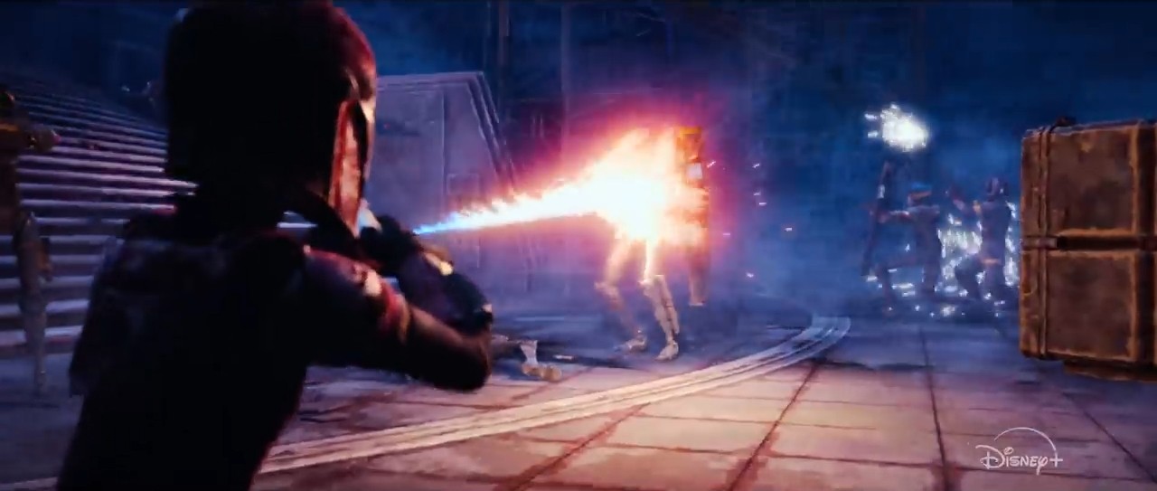 Fani Mandalorian też nie powinni narzekać, bo dostaniemy również i ich. Na pierwszym obrazku wojowniczka (prawdopodobnie Rook Kast) walczy z droidami przy pomocy miotacza płomieni. Na drugim rozmawia z Maulem - ze zwiastuna z Celebration wiemy, że tematem ich konwersacji jest potencjalna uczennica. Nawiasem, do roli kobiety ponownie wraca Vanessa Marshall, najbardziej znana jako Hera Syndulla.