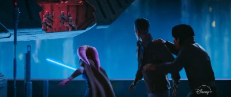 Oczywiście obecność Jedi niewątpliwie zwróci uwagę Imperium - w zwiastunie wielokrotnie możemy zobaczyć jak Devon i Eeko stają naprzeciwko szturmowców. Tutaj dziewczyna walczy z nacierającą kanonierką, w późniejszych kadrach widać jak ją przejmuje i sama pilotuje. Co ciekawe, towarzyszy jej Brander (który potem ostrzeliwuje wrogów z wnętrza statku) i jeszcze jakiś młodszy mężczyzna. W liście aktorów możemy wyczytać, że Charlie Bushnell (Luke w disnejowskim „Percym Jacksonie”) zagra kogoś o imieniu Rylee Lawson - może to syn?